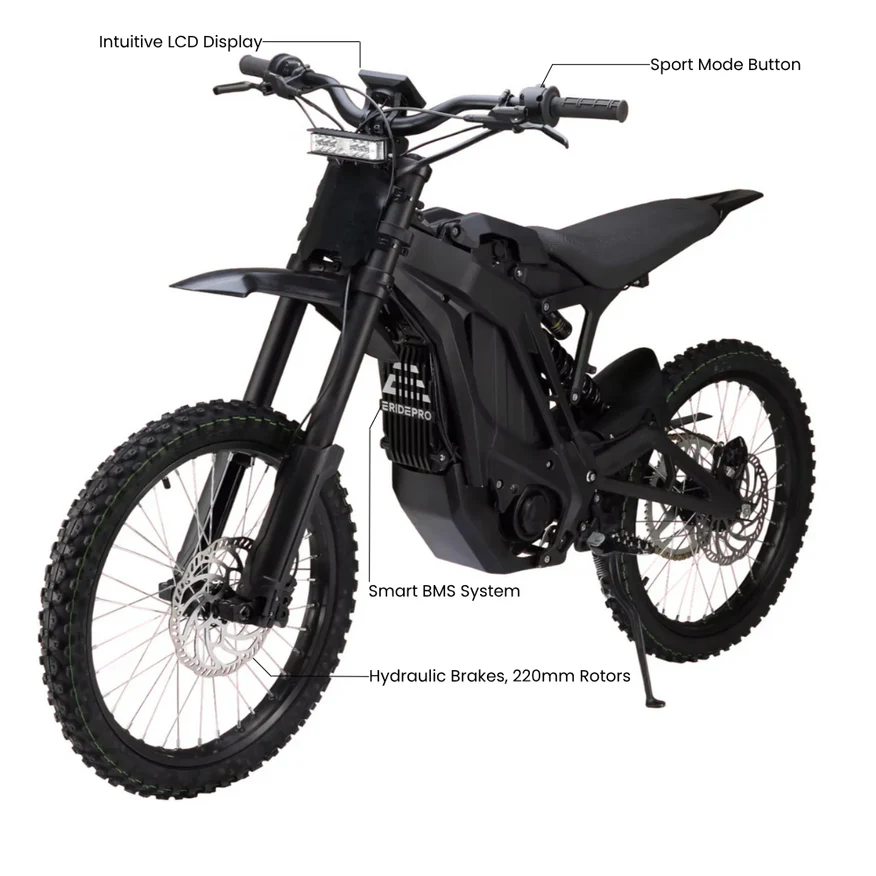 Embark on a thrilling off-road journey with the updated 2025 E RIDE Pro SS 2.0 – Long Range Electric Dirt Bike for Adults. Engineered to set a new benchmark in the electric dirt bike segment, this machine is capable of achieving formidable speeds thanks to its 72V motor. With speeds that rivals the Surron ebike and provides an alternative to the Talaria ebike, the E RIDE Pro SS 2.0 electric dirt bikes for adults is crafted for those who dare to push limits. This long-range electric dirt bike is engineered to deliver unparalleled power, speed, and durability.