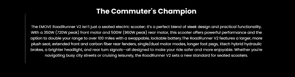 EMOVE RoadRunner-Pro Seated Electric-Scooter is not just suitable for city riding, but it can also handle dirt and off-road conditions with ease. Its powerful motors and grippy tires make it an excellent choice for use in any environment. With a single battery charge, you can ride up to 50 miles on or off the road.