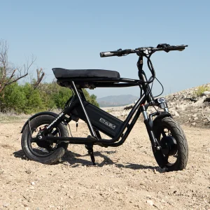 Twin encapsulated spring shocks at the front of the RoadRunner combined with its big 14” tires soak up rough terrain when riding on street or trail.